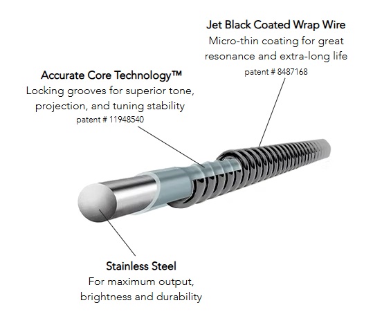 Accurate Core Technology™ upgrades the architecture by creating grooves on the core to cradle the wrap wire, allowing them to give clarity and definition to even the lowest notes of a 37" scale string. The difference is real.